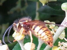 Die langen Fühler sprechen für ein Hornissen-Männchen (Drohne), wie auch Gesicht- und Körperzeichnung.