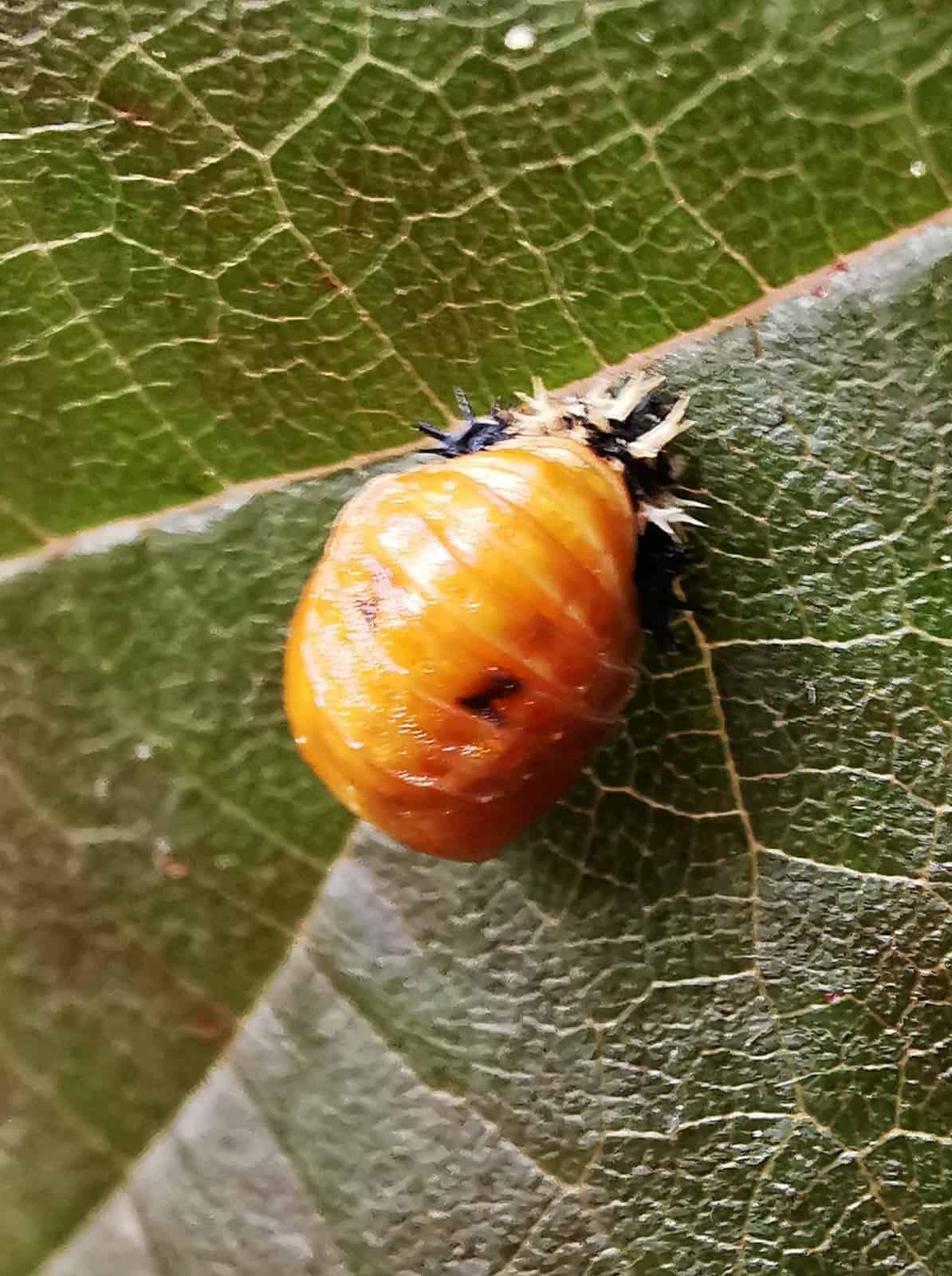 Es handelt sich um die Puppe eines Marienkäfers. Aufgrund der Auswüchse und der wenigen Punkte vermutlich um den Asiatischen Marienkäfer (Harmonia axyridis).