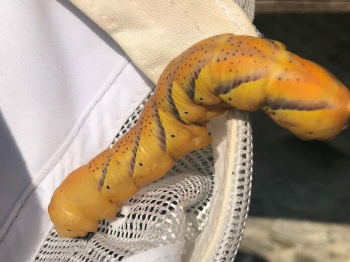 Dieses Jahr anscheinend öfter zu sehen, müsste die Raupe des Totenkopfschwärmers sein.