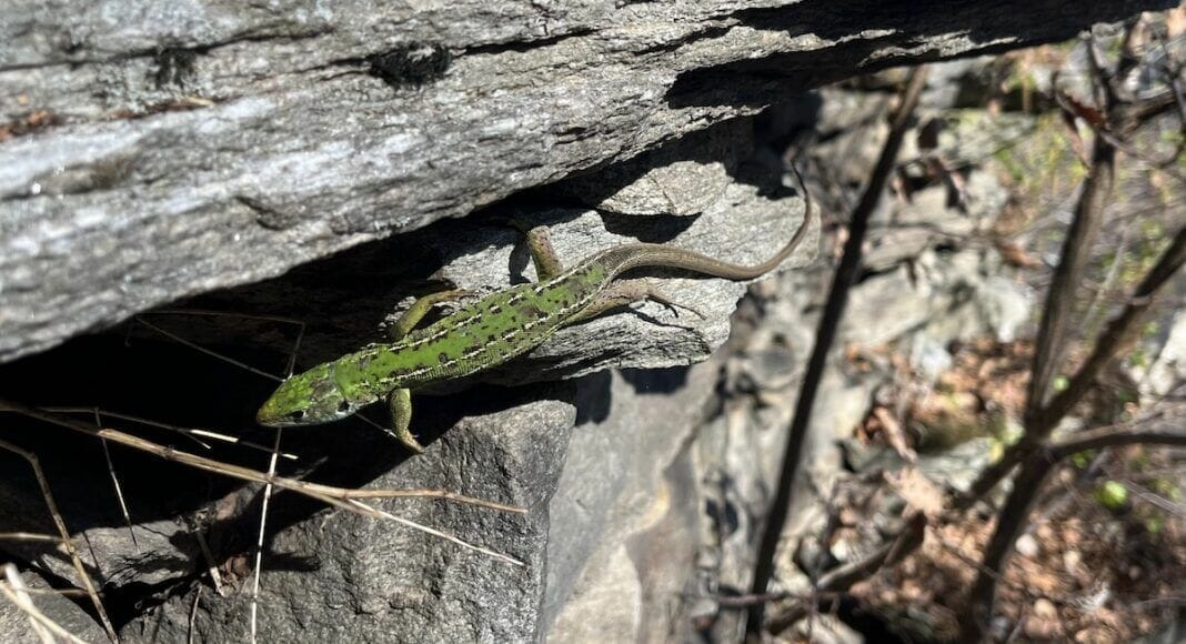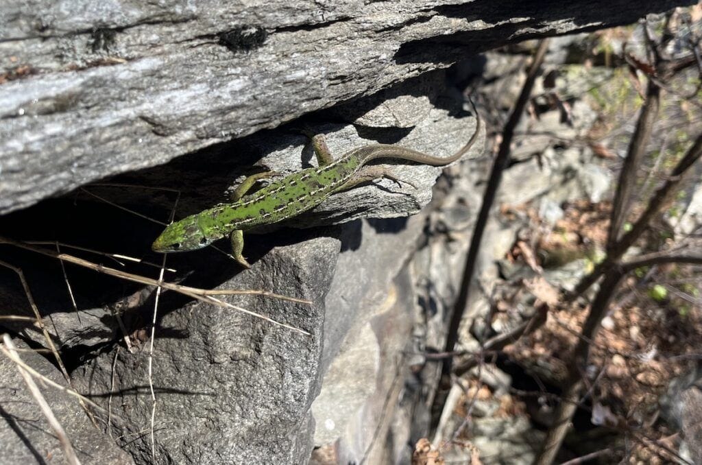 Es handelt sich um ein ausgewachsenes Weibchen der Westlichen Smaragdeidechse. Im Bergell gibt es auch von der Verbreitung her keine Zauneidechsen.