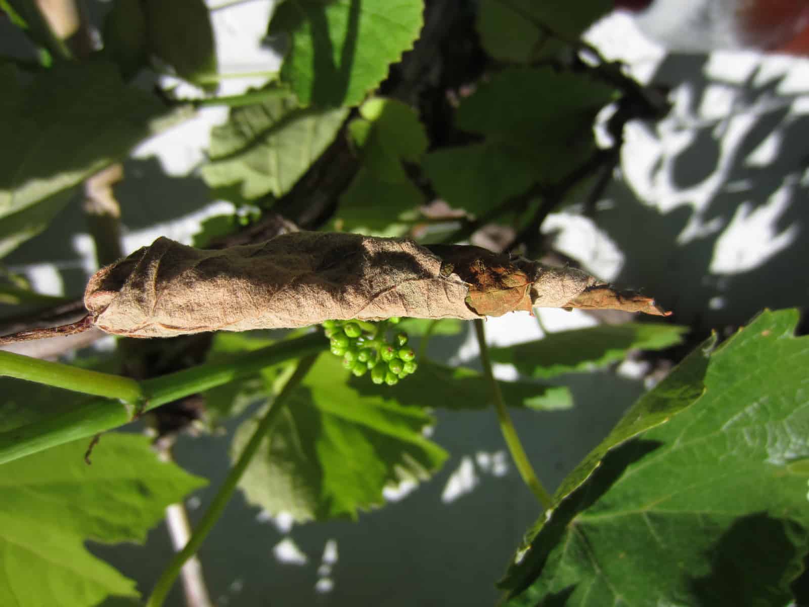 Seit einigen Tagen sieht eines der Traubenblätter so aus. Ich denke dass sich da jemand verpuppt, bloss wer?