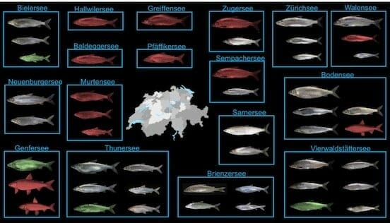 Mindestens 26 endemische Felchenarten fühlen sich in den Schweizer Gewässern – mehr oder weniger – wohl. In den letzten 60 Jahren sind zudem mindestens neun Arten ausgestorben und ein Dutzend Arten ist im Moment noch nicht einmal offiziell benannt. Sie unterscheiden sich genetisch, ökologisch und bezüglich Form und Gestalt. Entwickelt hat sich der Artenreichtum seit der letzten Eiszeit vor ca. 15 000 Jahren. Kommt eine Art nur in einem klar abgegrenzten Gebiet vor, wie zum Beispiel einem See oder einem zusammenhängenden Seensystem, und sonst nirgends auf der Welt, spricht man von endemisch. Genau das ist bei den 26 Felchenarten der Schweiz der Fall. Allerdings ist diese Zahl mit Vorsicht zu geniessen, da dies ein aktives Forschungsfeld ist.