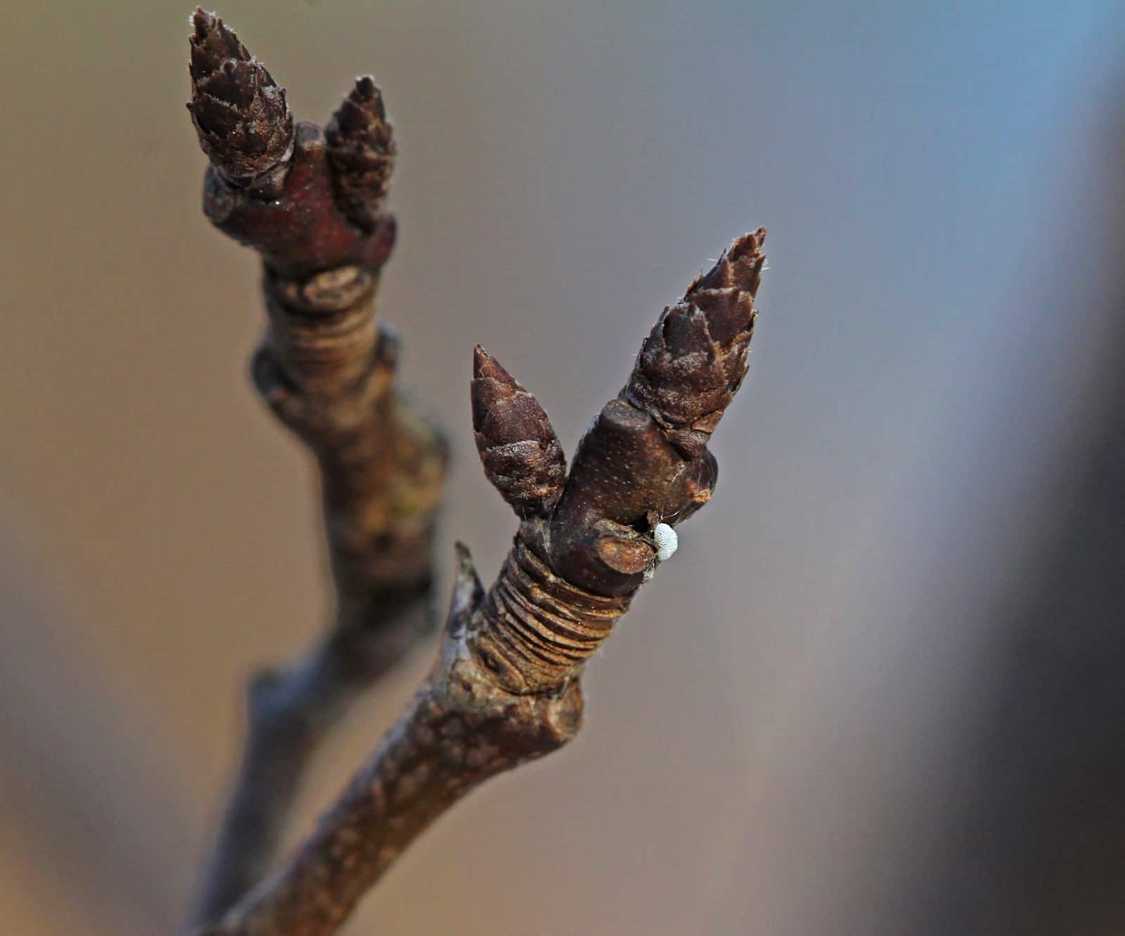 Im Winter, wenn das Laub fehlt, sieht man seine Eier besonders gut. Sie sind schneeweiss und winzig klein. Gelöcherte Gugelhöpfchen.