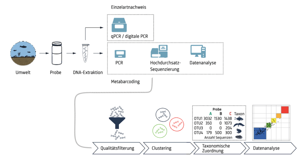 Umwelt-DNA (eDNA = environmental DNA) ist DNA, die aus einer Umweltprobe extrahiert wird, beispielsweise aus einer Wasser- oder Bodenprobe (Abbildung 1). Mit Hilfe von genetischen Methoden kann diese DNA isoliert, vervielfältigt und abgelesen werden (Abbildung 2). Die daraus gewonnenen Gen-Sequenzen erlauben eine Zuteilung zu bestimmten Organismen oder können direkt für das Verständnis der entsprechenden Genfunktionen genutzt werden.